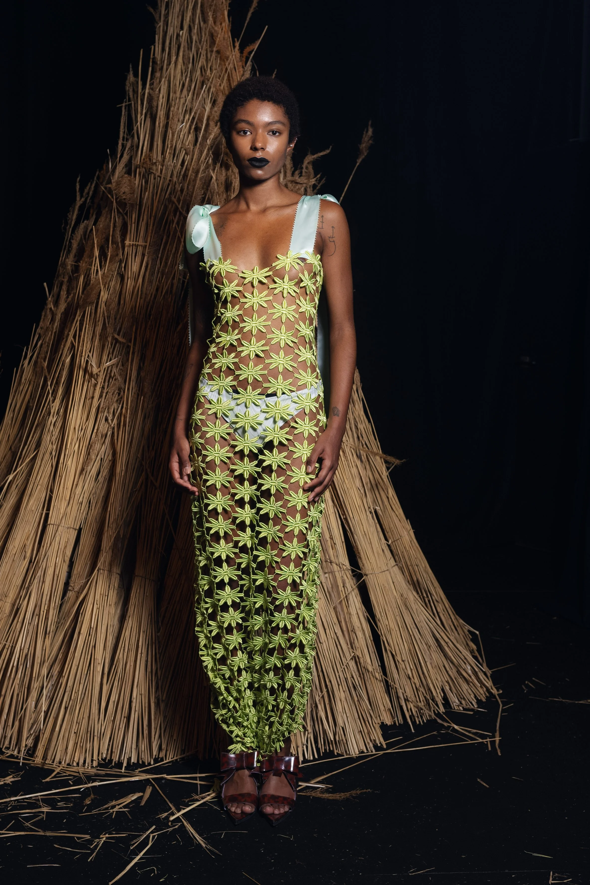 As part of the release of this season's collection, Leitner hosted an exciting presentation at 3537 in Marais. She produced a SS23 fashion film, drawing influence from the surroundings she grew up in, particularly the old ruins of Baden, the reed tents near the Neusiedlersee and the wine hills in Mörbisch. Set at the Neusiedlersee in Austria, the film embodies a fantastically eerie magic that runs through the whole collection. Those images from the film were recreated at the PFW presentation. Lightly choreographed models presented a total of 38 looks.