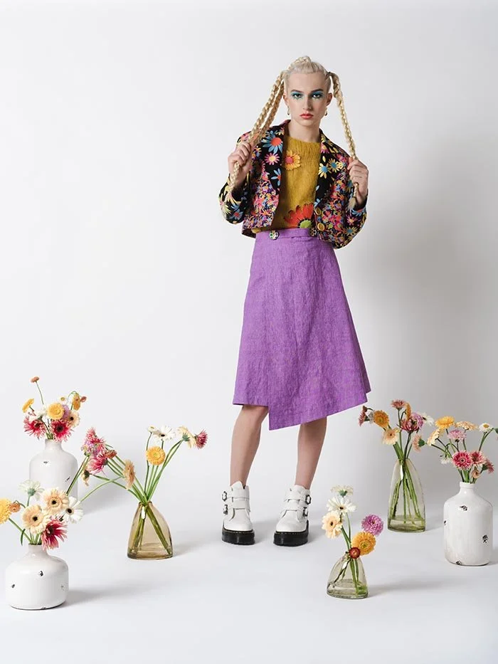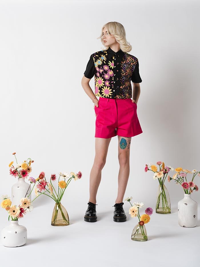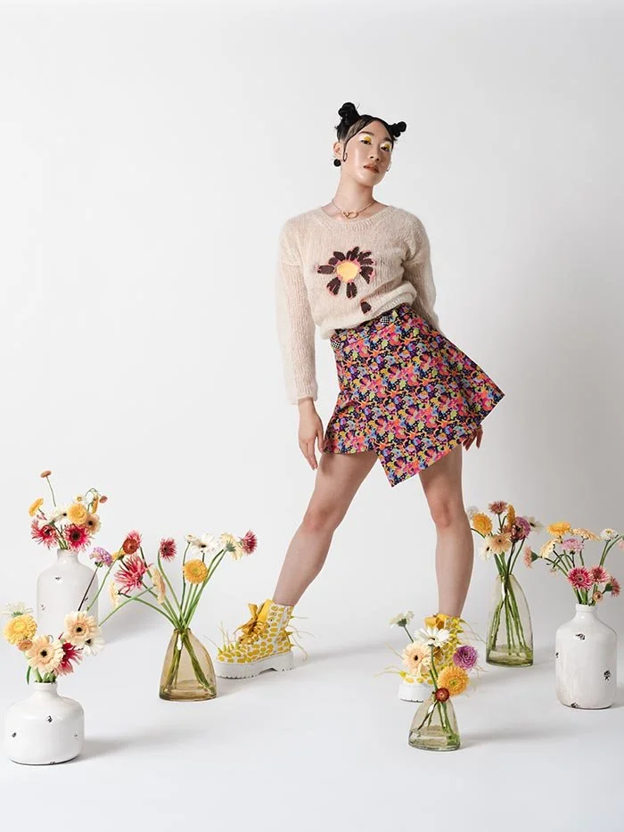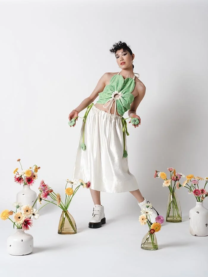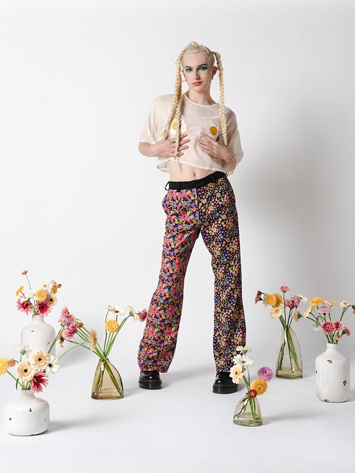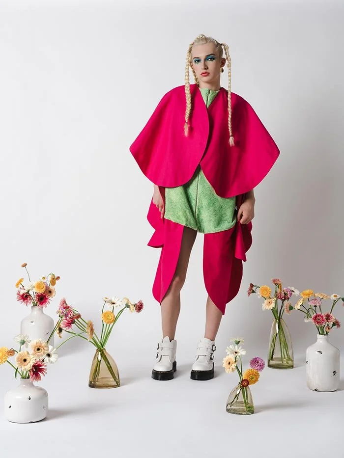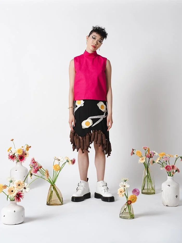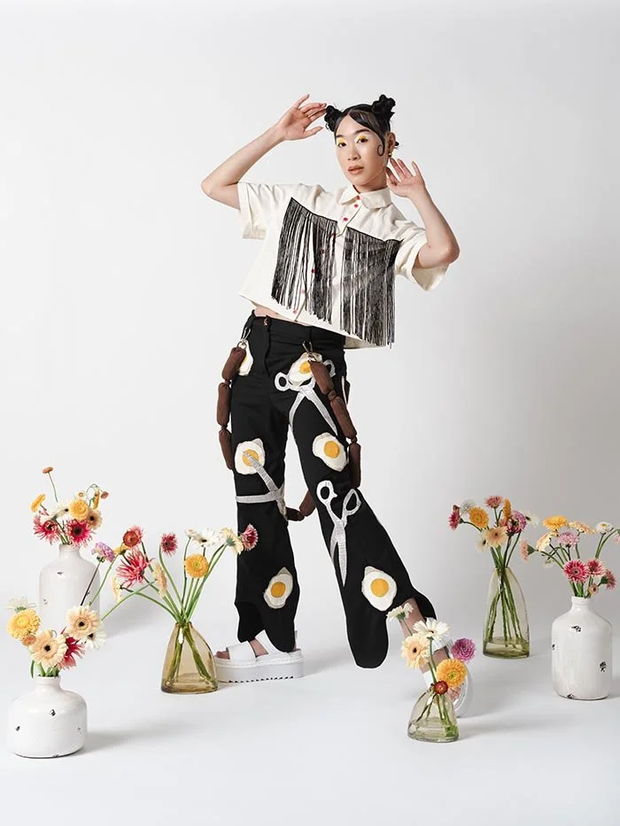 Melke's SS23 collection 'How To Act Like a Man' is inspired by the 1966 Czech film DAISES which follows the chaotic antics of two women named Marie who seek to embody and break free from the absurdity of gender stereotypes. Fed up with being seen as dainty dolls, they decide that since the world is in chaos, they too will be chaotic.