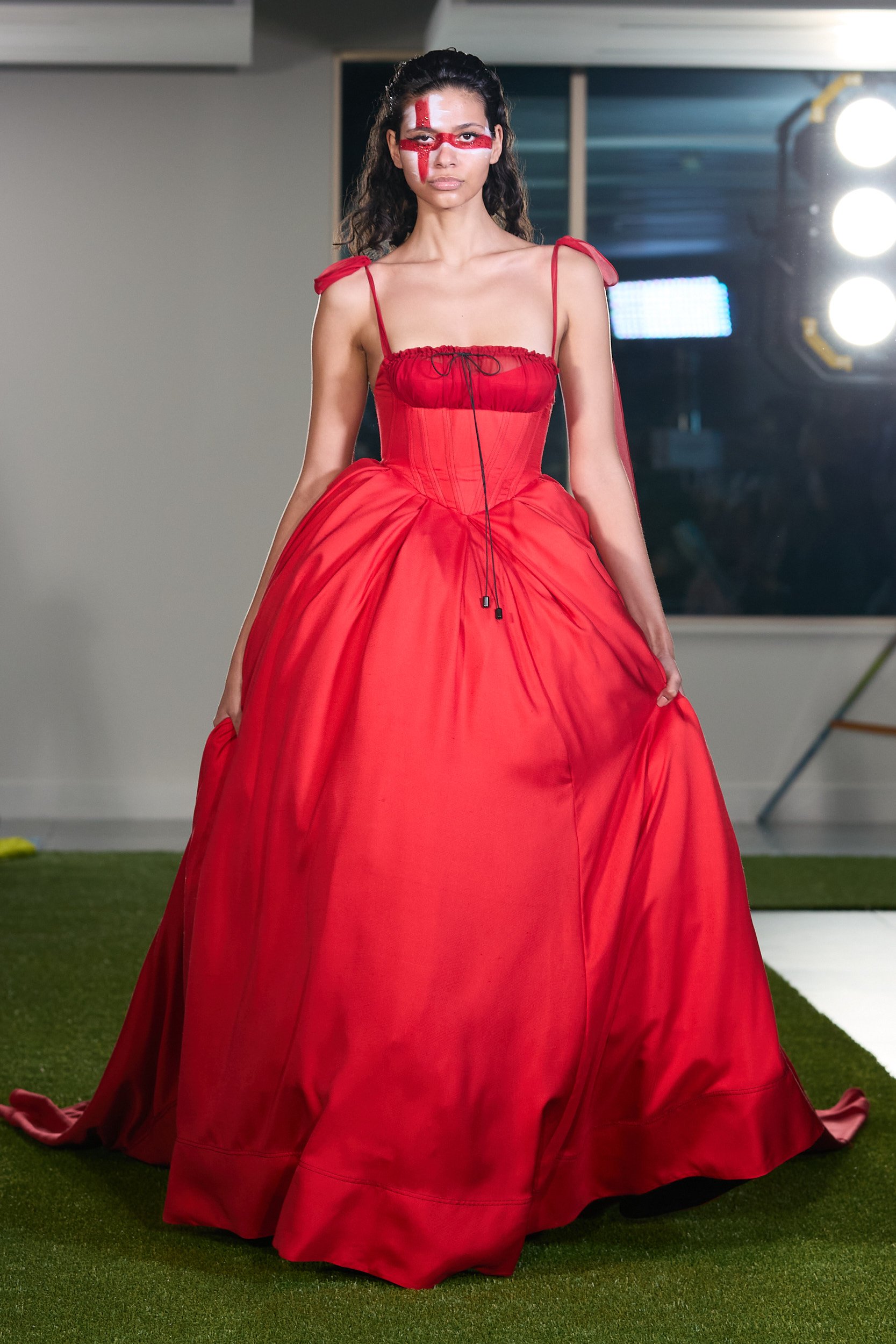 Redefining the beautiful game - McDowell works to further Queer culture in football; a historically exclusionary space to so many. Patrick reflects this in the collection by designing free of gender norms, blurring lines between princess and punter. In a time when football has never been so femme, McDowell has teamed up with The Lionesses star player Alex Greenwood, following their spectacular performance in The Euros, to embody the strong woman leading the way. Alex's Euro winning boots will walk the runway along with the release of images of the star wearing pieces from this new collection. A surprise appearance from members of The Bloomsbury football club will highlight their incredible work with thousands of young people weekly across london.