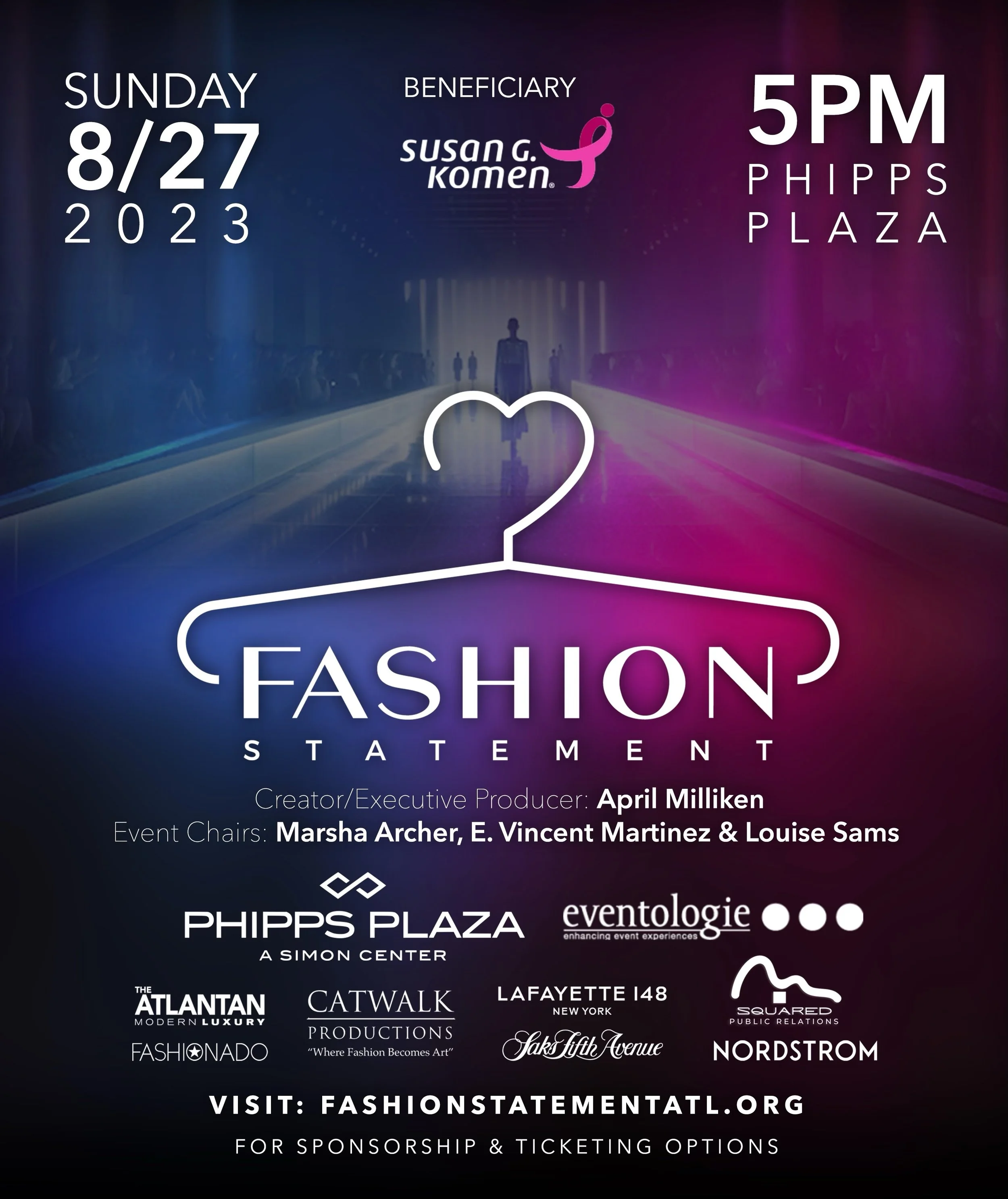 Fashion Statement, a premier fashion fundraiser, is pleased to announce its inaugural launch on Sunday, August 27, 2023, at the renowned Phipps Plaza. This highly- anticipated event aims to reunite fashion and philanthropy at Phipps, offering an unforgettable experience with proceeds benefiting Susan G. Komen Foundation.