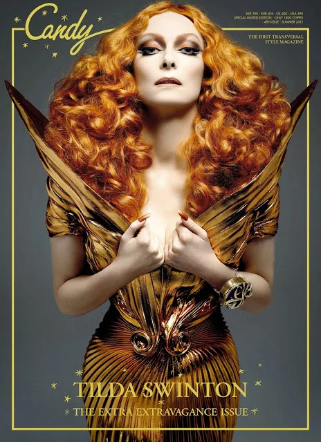 /Her film Orlando, in 1992, made an instant Tilda Swinton fan out of me. I've always been attracted to her androgynous style and appeal. Well now, the gender-bending avant garde Swinton delivers the most drag-a-licious perfromance through the cover and pages of transgender magazine, Candy. They [Candy] call it's fourth issue "The Extra Extravagance Issue" and if this editorial spread photographed by