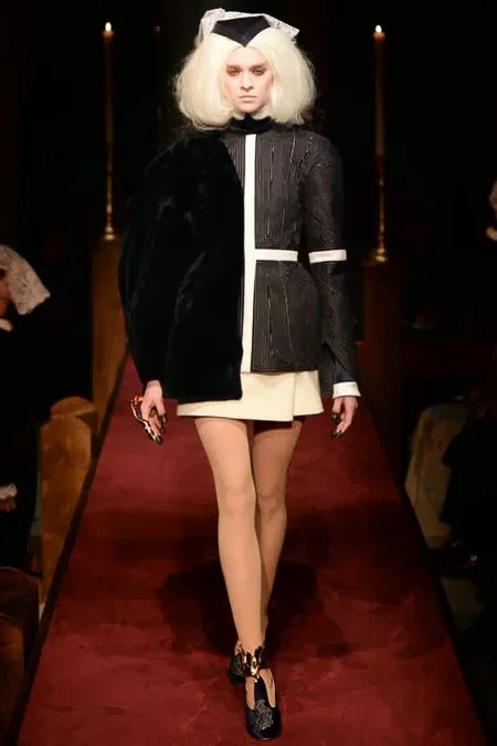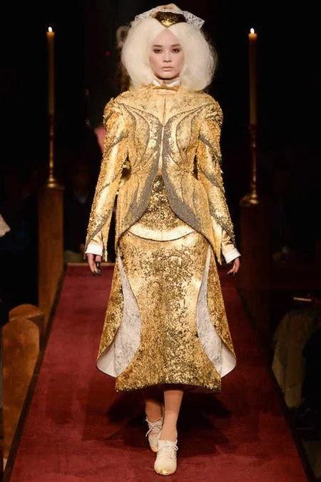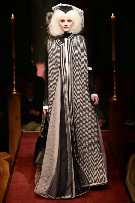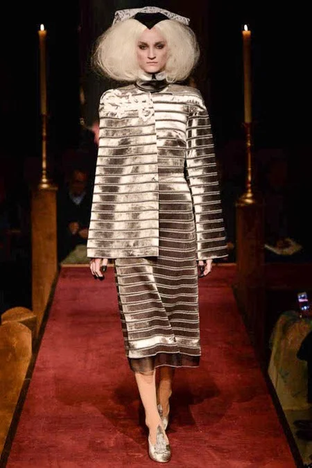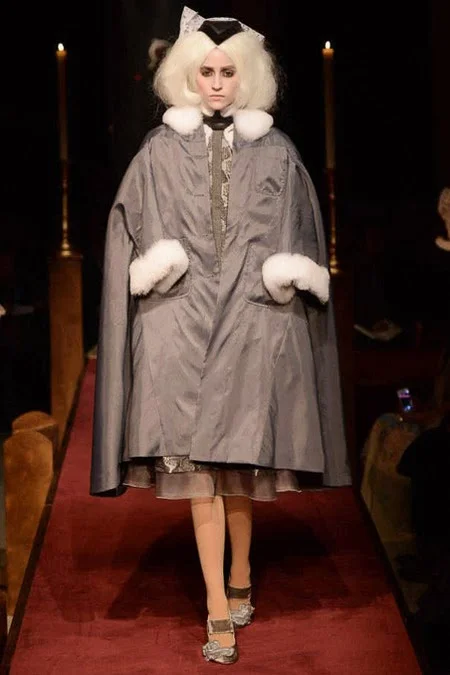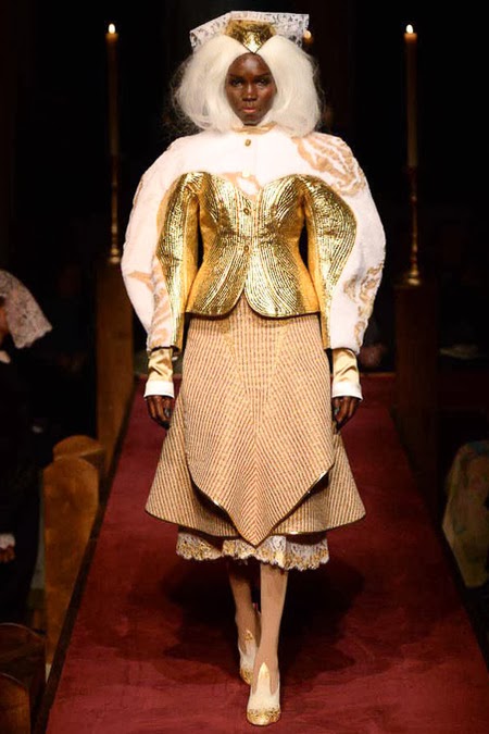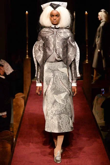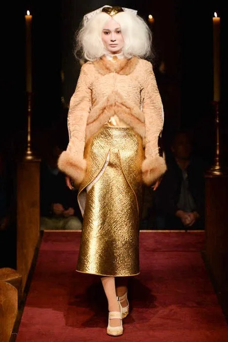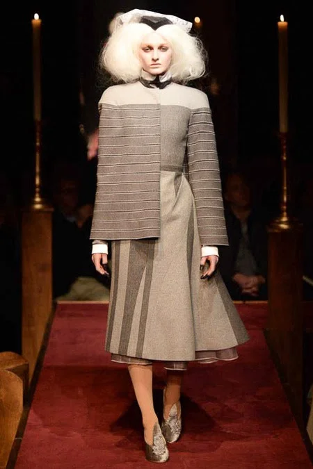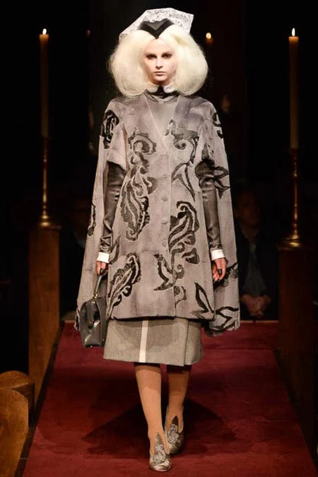 took us to fashion church for Fall 2014. It probably would have been sacrilegious to genuflect before the designer who recreated a church-like setting, complete with pews, at the Chelsea Gallery. I wonder if he was an alter boy, like me? ...In grand, Thom Browne showmanship, the 'runway' show is really more of an experience - and a feast for the senses! The balance of beauty and horror( as in creepy) gave way to sartorial excellence: signature textiles, exaggerated silhouettes and elaborate detailing. Amen.