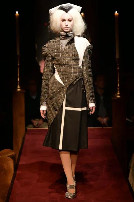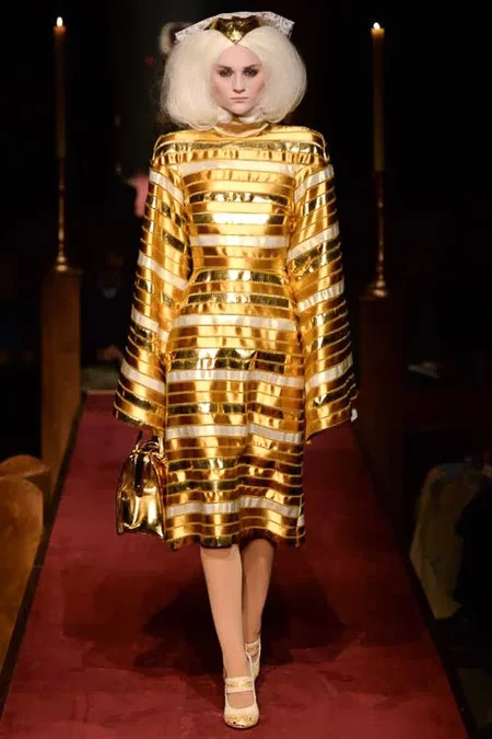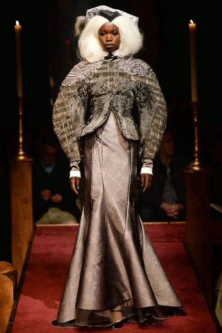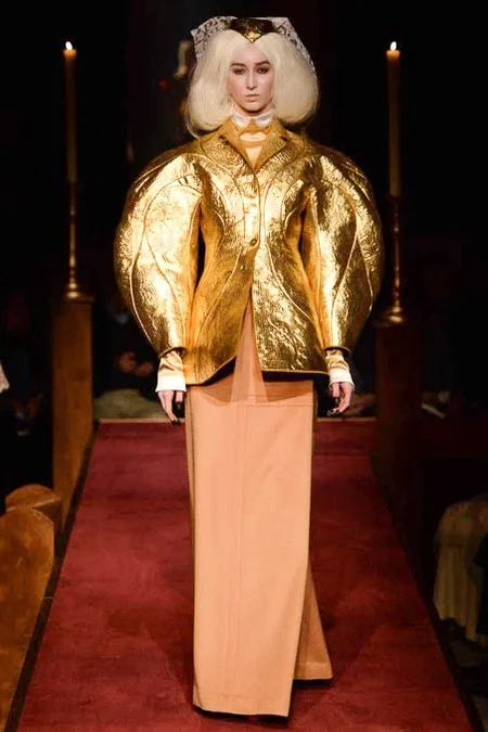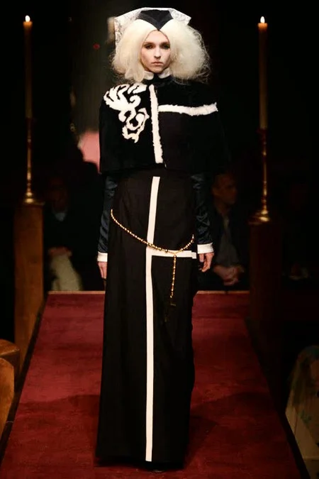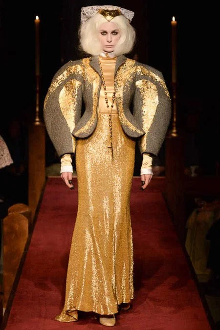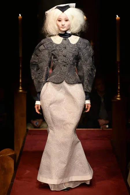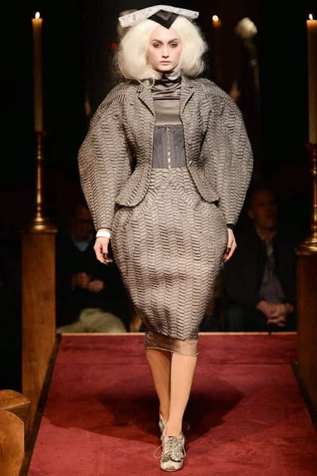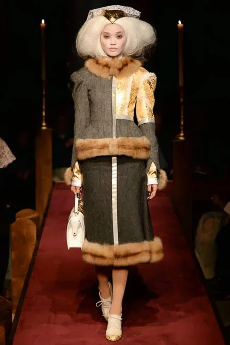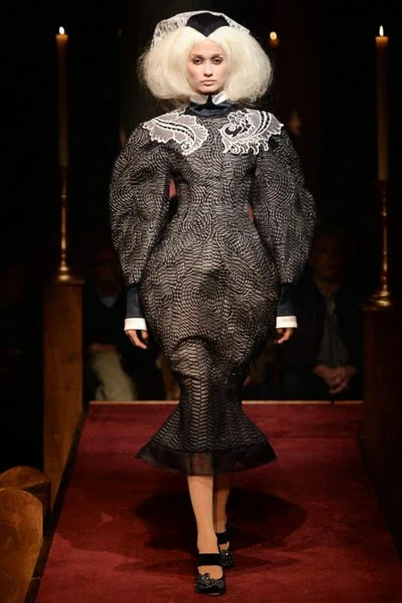 took us to fashion church for Fall 2014. It probably would have been sacrilegious to genuflect before the designer who recreated a church-like setting, complete with pews, at the Chelsea Gallery. I wonder if he was an alter boy, like me? ...In grand, Thom Browne showmanship, the 'runway' show is really more of an experience - and a feast for the senses! The balance of beauty and horror( as in creepy) gave way to sartorial excellence: signature textiles, exaggerated silhouettes and elaborate detailing. Amen.