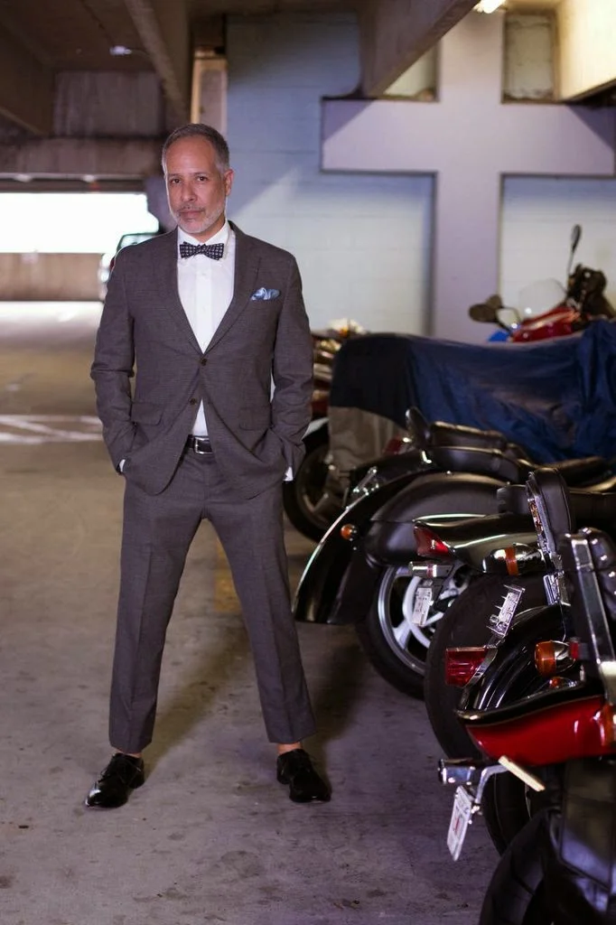 Because I like an edgier look, the pants are hemmed higher than "normal." You don't have to do that. The suit, as you can see, is a good fit - you can't go wrong with Banana Republic! I wanted a clean, crisp feel, so I chose a tailored-fit white dress shirt from Brooks Brothers. The shoes are Italian leather wingtips by Roberto Guerrini, the silk pocket square from Century 21 in NYC and the bowtie, vintage.