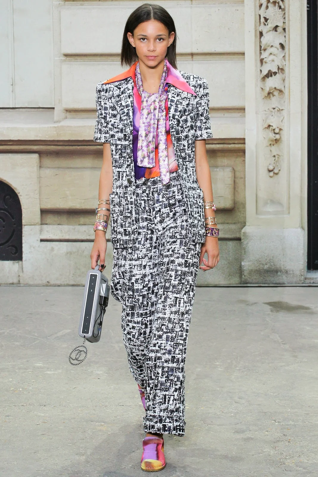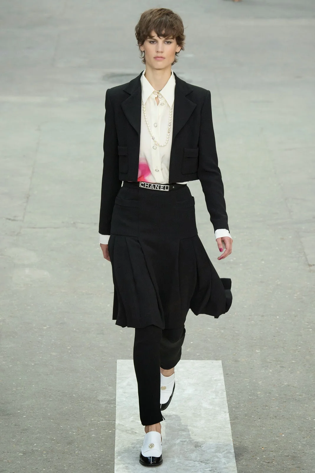 That section was amazingly poised. Tailoring is a subject du jour, but through the filter of Chanel consciousness, we saw tradition, femininity, and an energetic projection of the shape of today. Let’s put it down here: The opening, some of the wide, pleated trousers, was incredibly on point—a flipping of the Chanel tradition of opening with tweed skirtsuits—with playful snowballs of tulle and crystallized snowflakes thrown into the back of the girls’ hair.