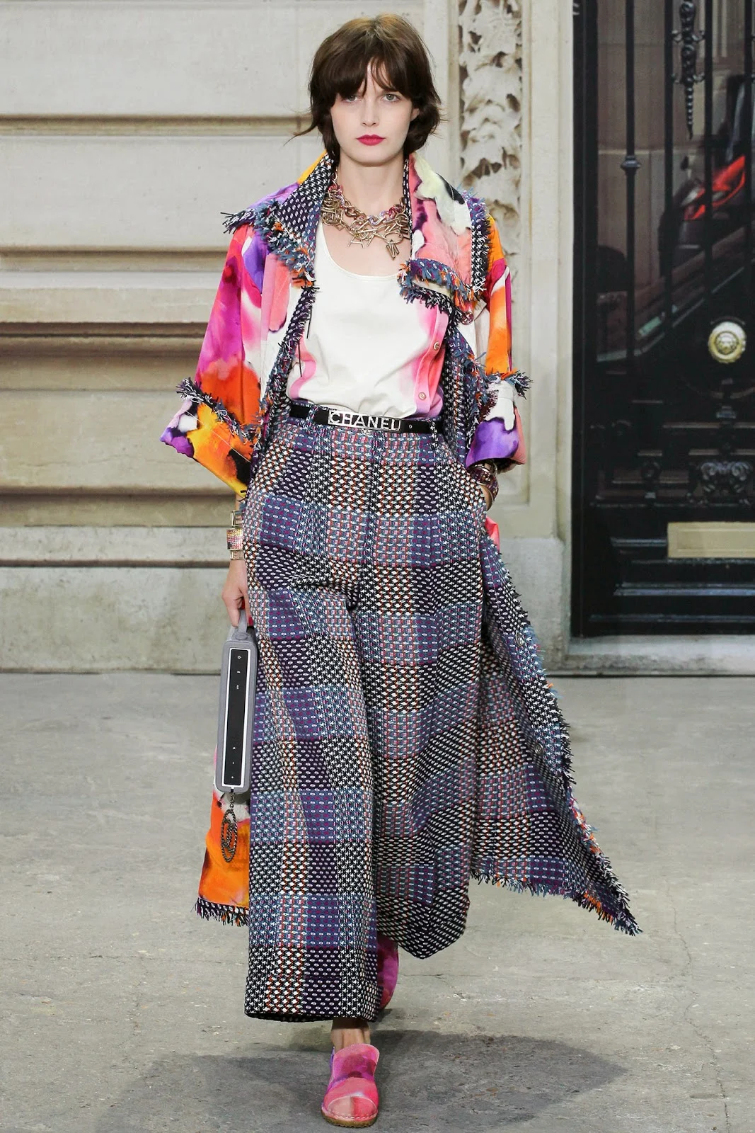 The Chanel girls—his crew, the latest generation he’d encouraged and quipped with in the Chanel studio since 1983—were clearly conscious of the ceremonial responsibilities they had. They trod the “snow,” hands in pockets, insouciantly proving what a perfectly considered collection of wide-legged trouser suits these were—with long, swirlingly soft, checked tweed coats he’d envisaged in tandem with his longtime right-hand Virginie Viard.