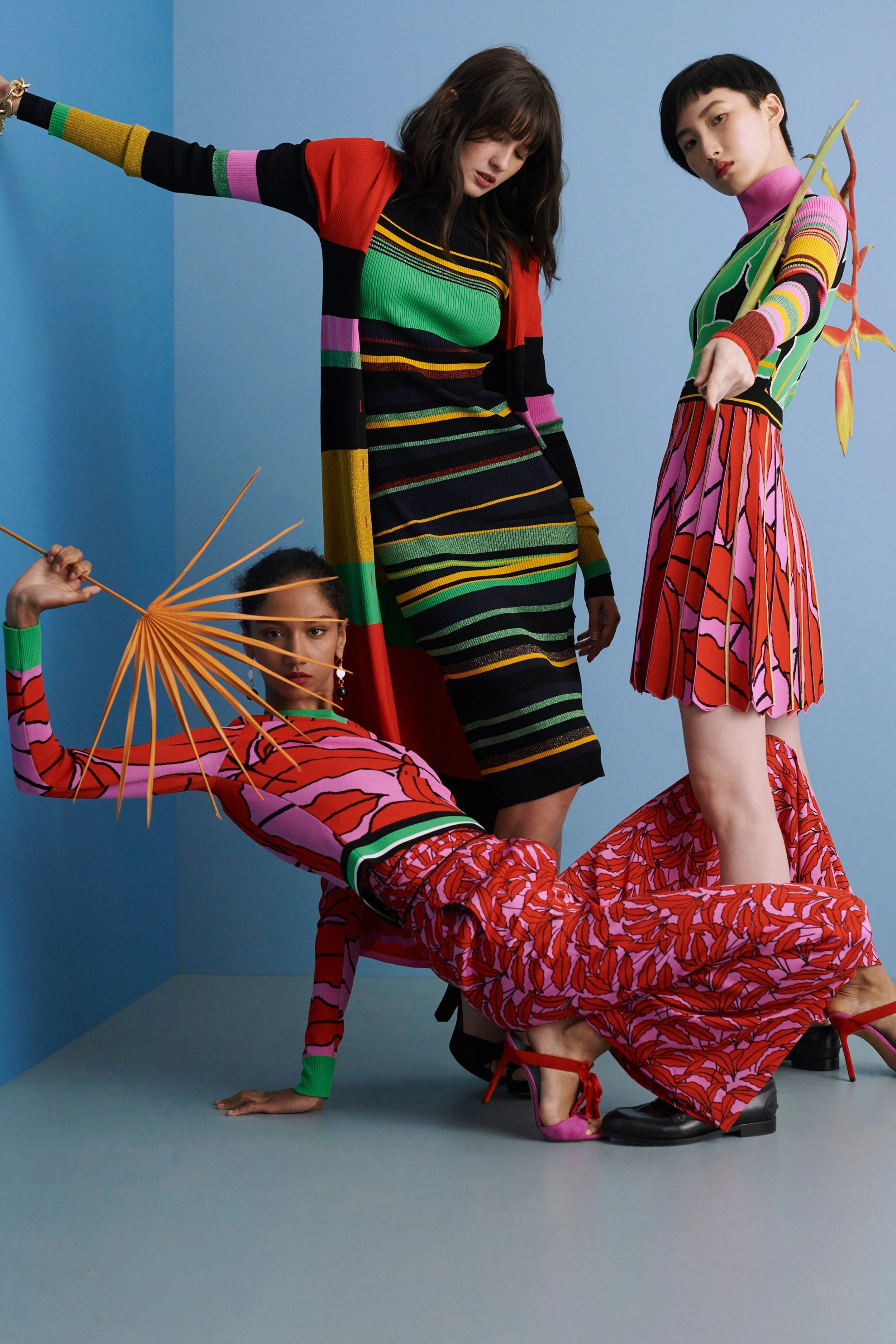 Bold, lush and ditzy florals feature alongside the house Sutra Chain, and the blown up logo appears on wraps and swimwear. Vibrant intarsia knits in Pop Art pantones depict tropical palm leaves and the Leopard Poppy print. The dragonfly appears embroidered and printed, symbolizing transformation and renewal, welcoming in the holiday season and celebrating the New Year ahead.