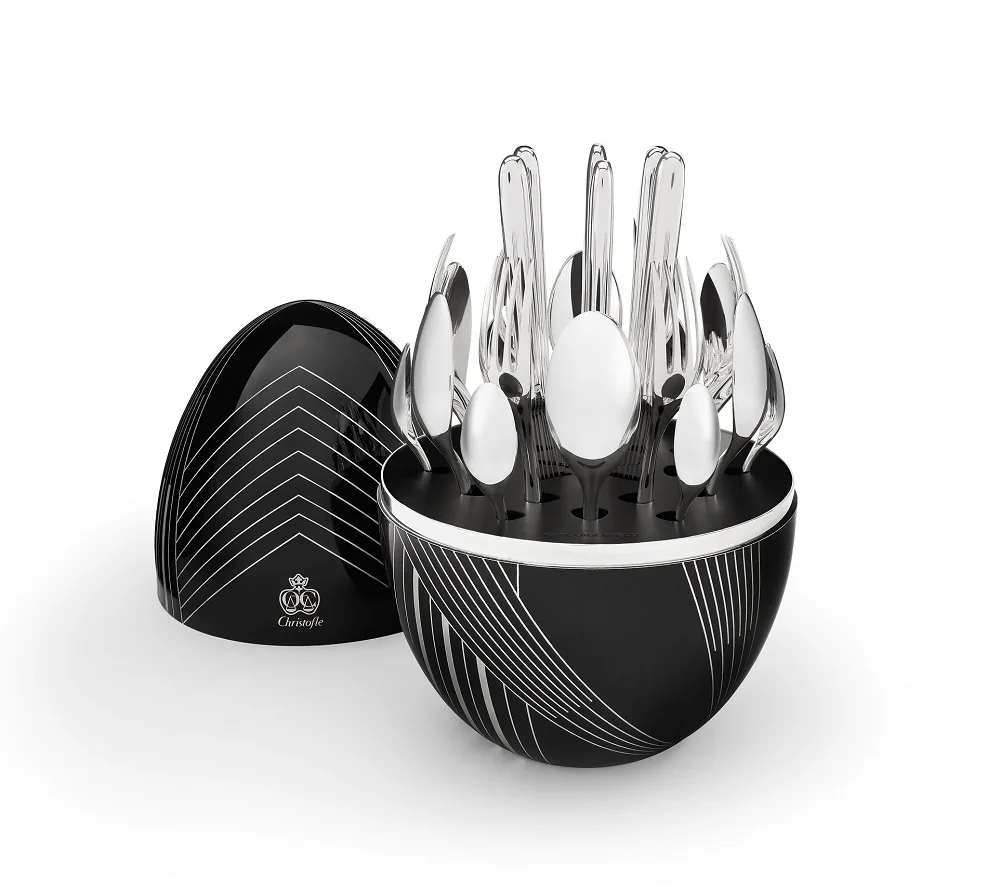 KARL LAGERFELD has designed a limited edition of the Christofle “MOOD” with just 1,500 exclusive pieces available worldwide “PARIS, FRANCE – Christofle and KARL LAGERFELD are pleased to announce their collaboration to introduce an exclusive KARL LAGERFELD edition of the MOOD flatware set and decorative case. Designed by KARL LAGERFELD, the piece will be available in two exclusive colorways and produced in limited quantities. The first time in Christofle’s history it is collaborating with a fashion brand, and Karl Lagerfeld, is a long-time Christofle connoisseur, with many pieces in his own home. ” Inspired by Art Deco art and architecture, KARL LAGERFELD’s design features structured, graphic lines on the elliptical egg shape, which enhances the contrast of geometry. The polished silver option is made from mirrored stainless steel, with 1,000 pieces available. The sleek black option is crafted from lacquered stainless steel, with just 500 pieces made. Both are engraved with the Christofle coat of arms on one side and KARL LAGERFELD’s signature on the other, and each will be numbered on the bottom. The designs have also been exquisitely photographed by KARL LAGERFELD. The MOOD opens to reveal a 24-piece set of silver-plated flatware, and each piece is stamped with the KARL LAGERFELD silhouette logo. This flatware will only be available in the KARL LAGERFELD MOOD, and not individually sold. The KARL LAGERFELD MOOD is not only a dramatic decorative object, but a useful piece for every home — whether used for special occasions or everyday life. The MOOD is Christofle’s most renowned design that reimagines the classic codes of table setting. It is secretive in its function as it appears streamlined and sleek on its exterior, though it opens to reveal a 24-piece silver-plated cutlery set. The MOOD is synonymous with excellence in silversmithing and reflects Christofle’s avant-garde vision for relaxed entertaining that is both elegant and refined.