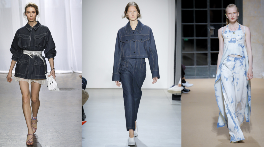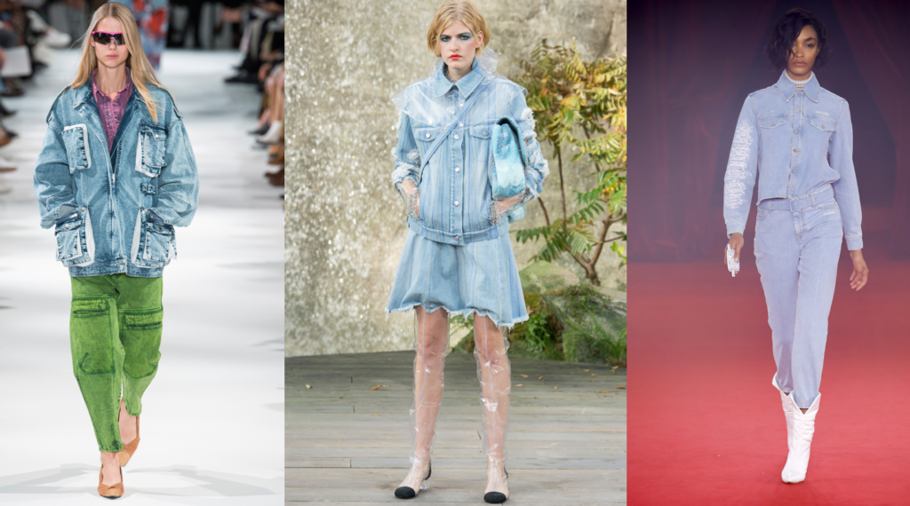 This season underlined how playful and versatile a total denim outfit can be, from dark wash with contrasting white stitching and ultra feminine corset at Mugler and the vibrant color washed combos at Stella McCartney to the layered grey denim pieces cut in a loose boyish shape at Givenchy. Indeed, as the trend has returned, it comes with new rules, or rather an absence of rules and adapts easily to a diverse array of styles. Total denim is a fashion chameleon, allowing denim aficionados transform the look by mixing cuts, shades and washes, but also using embellishments like studs, pearls and perforations to elevate the outfit.