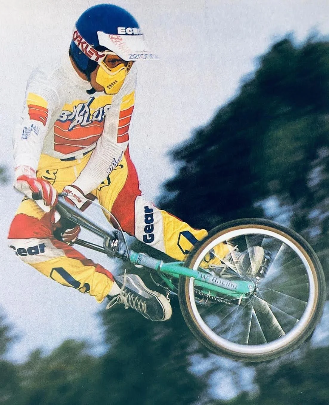 Oakley continued developing high-performance sports sunglasses throughout the 1980s. The Mumbos (now called M-Frames) were readily adopted by the then-new sport of mountain biking - particularly the riders who’d come up through BMX like John Tomac and Tinker Juarez.