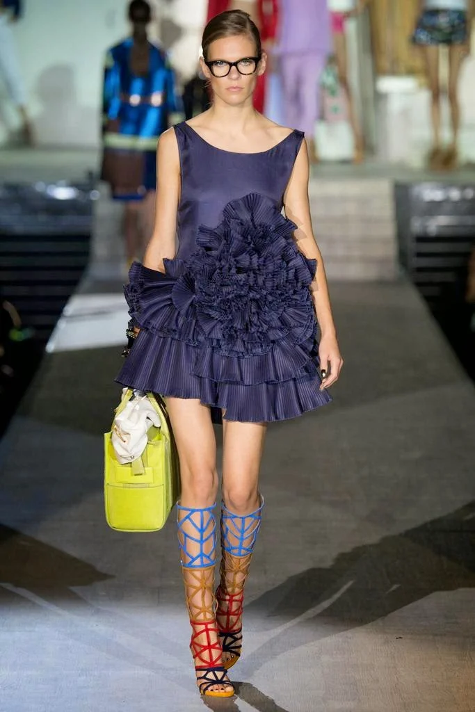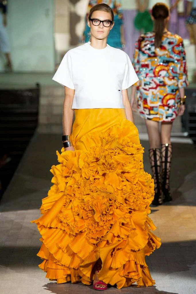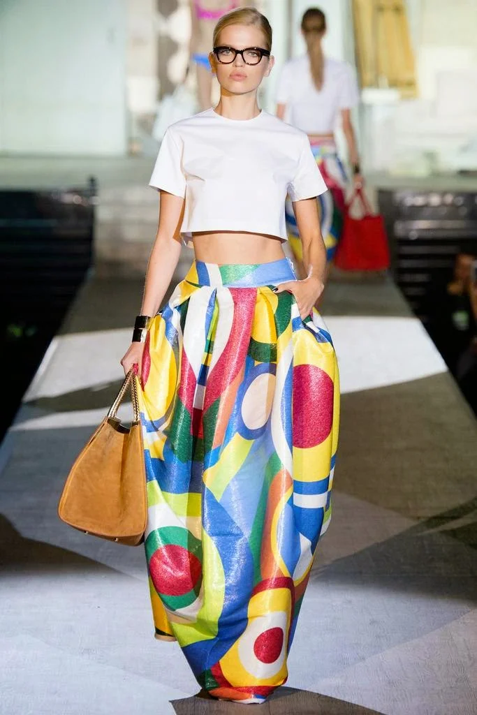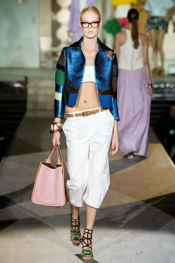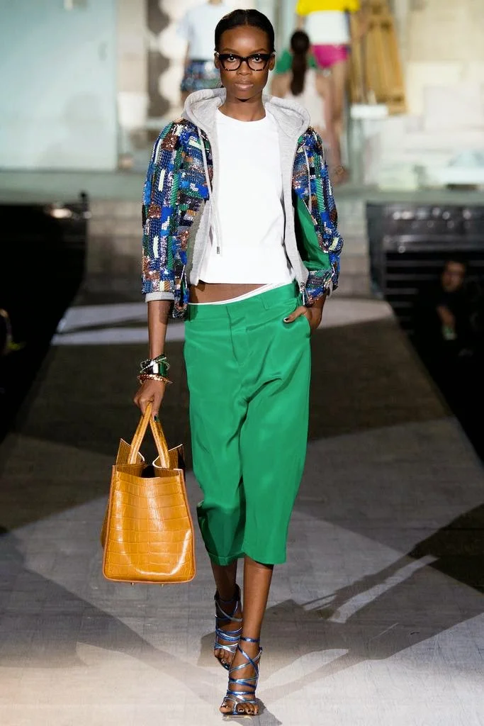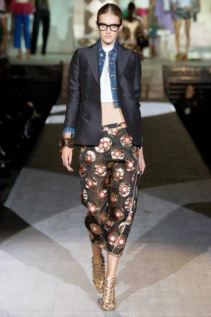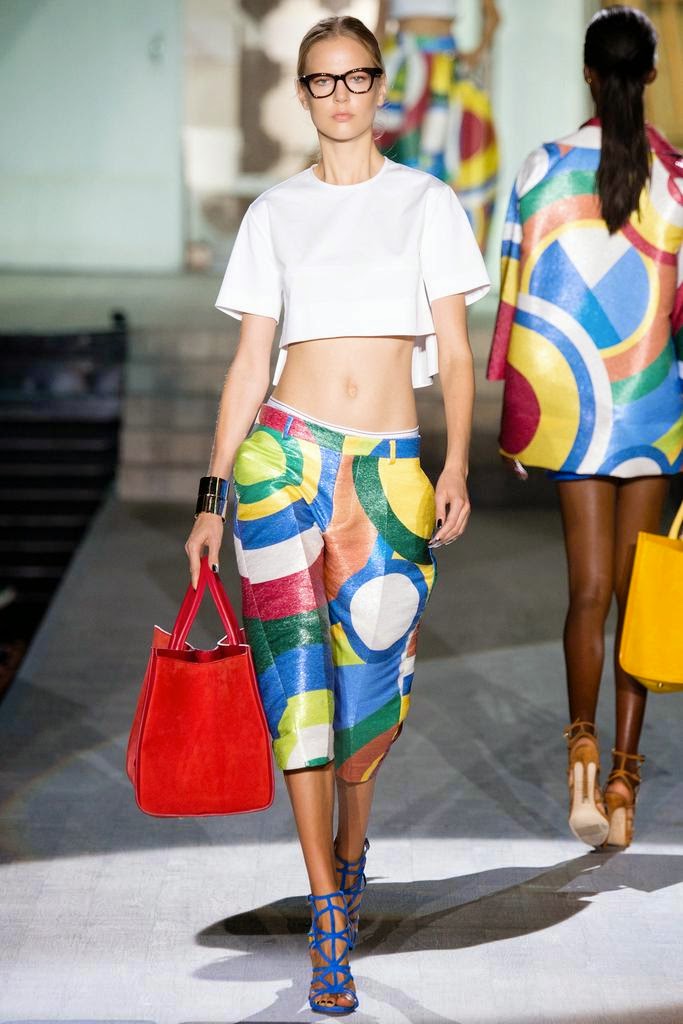 for Spring 2015. The Caten twins, Dean and Dan are revealing a more sophisticated approach. I like it. The sex is still there but it has been refined and polished in silk raffia and beadwork. I especially appreciated the juxtaposition of pairing "casual" crop tops with full skirts and denim jackets or jeans with perfectly tailored blazers. The bold, colorful prints and patterns Dsquared featured throughout the collection was inspired by the work of contemporary artist