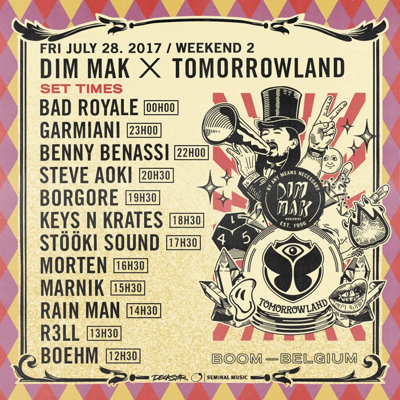 On Friday, July 28th, Dim Mak returns to Tomorrowland (Weekend 2) in Belgium, hosting their 6th official stage and showcasing the label’s evolution with an eclectic bill that spans the electronic dance music spectrum. Today, we’re thrilled to reveal the official set times for the fan-favorite Dim Mak stage, featuring sets by Steve Aoki and in alphabetical order: Bad RoyaleBenny BenassiBoehmBorgoreGarmianiKeys N KratesMarnikMORTENRain ManR3LL and Stööki Sound. To get you excited for these incredible performances, MORTEN has created the perfect Tomorrowland DJ Mix, featuring Steve Aoki’s latest hit “Night Call feat. MigosLil Yachty,” Rain Man & MAX’s recent Dim Mak release “Do You Still Feel?,” plus new music from Keys N Krates, Borgore, MORTEN and much more. Check out the set times below because you won’t want to miss all the action at the Dim Mak stage.