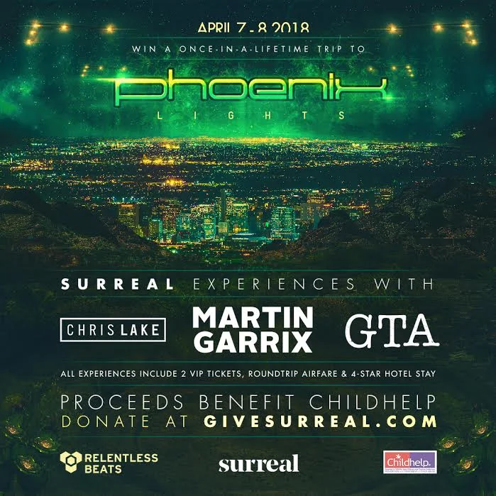 Relentless Beats is pleased to announce the return of its partnership with Surreal, a fundraising platform that works with festivals and musicians to offer fans once-in-a-lifetime experiences, with proceeds benefitting a charity of its choice. Bringing even more excitement to Phoenix Lights, a two-day music festival taking place at a brand-new, custom-built, permanent venue- The Park at Wild Horse Pass on April 7 and 8, 2018, Relentless Beats and Surreal have created three exclusive artist-based experiences which fans can enter with one winner chosen for each. Each winner will receive a VIP ticket to Phoenix Lights for themselves and a friend, roundtrip airfare, 2-night stay at the Phoenix Renaissance, as well as the artist experience they entered. Net proceeds from the campaign will benefit Childhelp, a national nonprofit organization which exists to meet the physical, emotional, educational, and spiritual needs of abused, neglected and at-risk children.